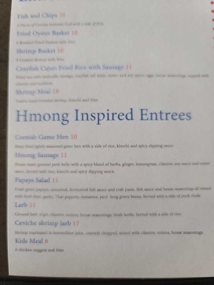 - Notable highlights include the flavorful shrimp boil and the Hmong style egg rolls, praised for their freshness and aromatic sauces.